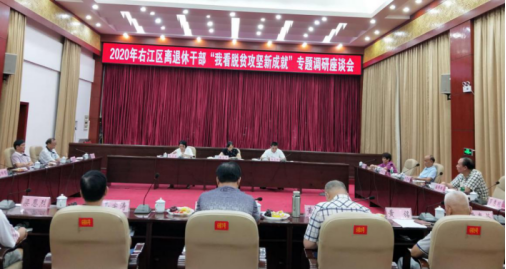实地参观考察后,召开了专题调研座谈会,区委副书记张芝杰、区委组织部部长杨应颖出席了会议。会上,张芝杰同志向各位老领导、老同志通报了我区2020年上半年打好脱贫攻坚收官战情况和经济社会发展情况。老干部们根据所观所感,充分肯定了右江区脱贫攻坚工作取得的成效,为右江区打赢脱贫攻坚战积极献言献策。