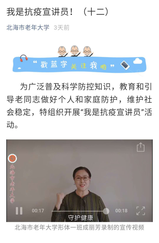 为了缓解疫情带来的心理压力,让老同志们宅家防疫“玩出新花样”,“网上老年学堂”除了保证最基础的教学任务,还开展丰富多彩的线上“课外活动”,积极组织老年学员们参与抗疫诗词歌赋创作、“我是抗疫宣讲员”、“学唱防控咸水歌”等系列活动,引导广大学员自觉遵守防疫要求,积极传播正能量。