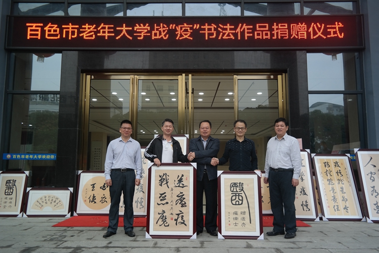 真情透纸背,笔墨传心声。3月25日,一场别开生面的捐赠仪式在百色市老年大学举行,百色市政协原主席、市老年大学名誉校长周炳群将自己近期精心创作的24幅战“疫”主题书法作品赠予右江民族医学院附属医院、百色市人民医院,向白衣天使、战“疫”英雄表示诚挚慰问和崇高敬意。
