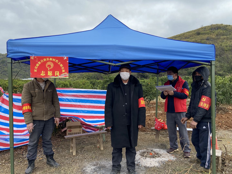 在富川瑶族自治县福利镇福利村委牛坝自然村卡点,一位精神矍铄的老人笔直地站在简陋的遮雨棚前,耐心地劝导外出人员要带好口罩,回家后要及时洗手、消毒。