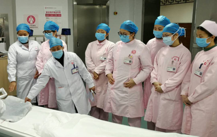 图左三为肖年英在指导医务人员。