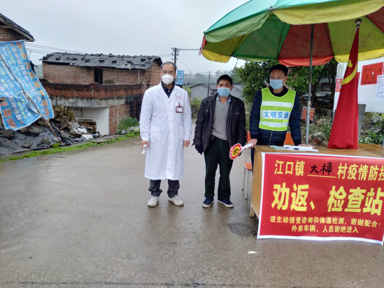2月5日一大早,在桂平市江口镇大樟村的疫情防控劝返检查点,1名佩戴着党徽的老党员和村干部一起冒着寒风冷雨,紧张又有序地做着防控工作。每当有行人和车辆前来,他都上前仔细登记人员信息,并不忘提醒他们这段时间尽量不要外出。