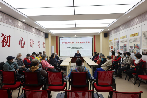 活动中,首先由梧州市委老干部局副局长、市委离退休干部工委副书记赖正波为老同志上了一堂学习贯彻党的二十大精神的微党课。赖正波结合自身的理解和学习,以“12345”为关键词,从“一个主题”“两个确立”“三个务必”“四个民生保障”“五个必由之路”五个方面层次分明、深入浅出对党的二十大的核心要义、精神实质和深刻内涵进行了全面的阐述,引起了大家的强烈共鸣。赖正波指出,“做好离退休干部工作”写入党的二十大报告中,充分体现了以习近平同志为核心的党中央对离退休干部工作的高度重视,对广大离退休干部的亲切关怀。他结合工作实际,用通俗易懂的语言向大家分享了加强思想政治引领、学习贯彻好中办文件精神、深入开展“六好”离退休干部党支部建设活动、建好用好“金秋家园”活动场所和用好“老年大学”活动阵地等方面的内容,老党员们聚精会神聆听党课,每个人都收获满满。