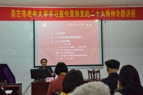 12月5日,崇左市老年大学举办学习宣传贯彻党的二十大精神专题讲座,邀请市委党校副教授农飞以《学习党的二十大精神》为题进行宣讲。市委组织部副部长、老干部局局长农冬梅,市老年大学校长谭先进出席,市老年大学副校长方燕琼主持,市委老干部局干部职工、市老年大学部分学员代表共50多人聆听讲座。