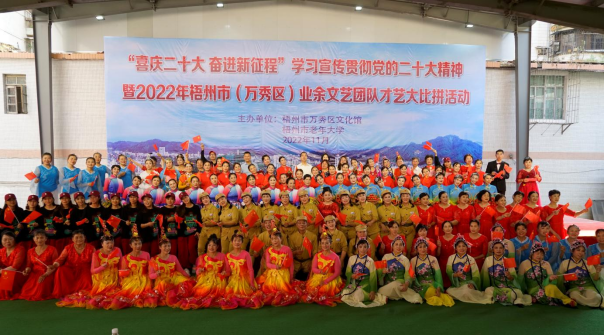 11月21日上午,初冬梧州,暖阳映照。由梧州市万秀区文化馆、梧州市老年大学联合举办的“喜庆二十大 奋进新征程——学习宣传贯彻党的二十大精神暨2022年梧州市(万秀区)业余文艺团队才艺大比拼活动”在市老年大学校园舞台火热上演。来自万秀区和市老年大学的16支业余文艺团队以舞蹈、莲花板、情景剧、小组唱等丰富多彩的表演形式,表达爱党、爱国、爱社会主义的真挚情怀,以文艺比拼的形式凝聚起新时代长征路上的奋进力量,为贯彻落实党的二十大精神写下生动注脚。