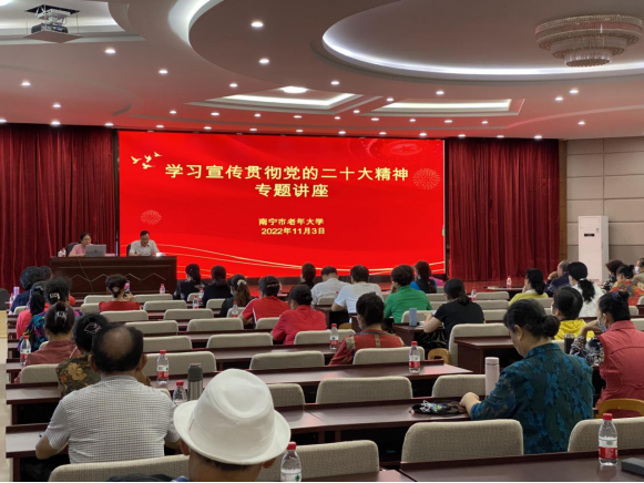 为迅速掀起学习贯彻党的二十大精神热潮,持续深入学习报告中提出的新思想、新理念、新观点,11月3日,南宁市老年大学举办主题为“以中国式现代化全面推进中华民族伟大复兴”的学习贯彻党的二十大精神专题讲座。