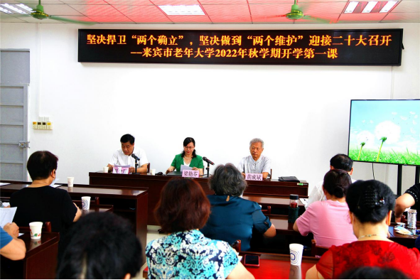 金桂香飘天地,银发欢歌万里。在举国上下喜迎党的二十大召开前夕,9月9日,来宾市老年大学秋季学期开学。来宾市委组织部副部长、老干部局局长梁艳芬到校,以《坚决捍卫“两个确立”,坚决做到“两个维护”,发挥正能量,喜迎二十大》为题,上了精彩第一课。
