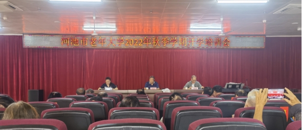 9月2日上午,河池市老年大学召开2022年秋季学期开学培训会,传达学习有关会议精神,安排部署新学期工作。市委老干部局分管领导、市老年大学领导班子、市老干部活动中心全体干部、各班教师和临时党支部书记、副书记,班长、副班长,以及老年大学社团及协会负责人60多人参加培训会。