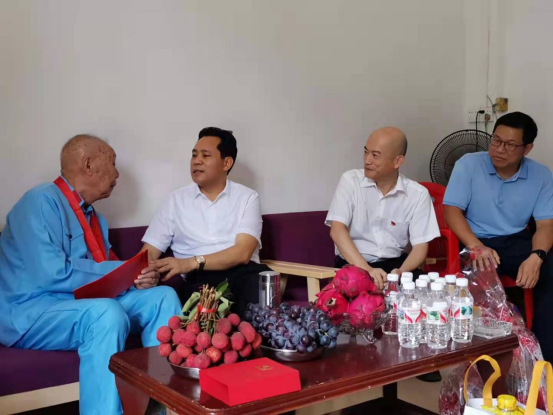 在中国共产党建党100周年到来之即, 6月28日,自治区党委常委、自治区副主席黄世勇一行4人到龙州县看望慰问离休老党员谭安昌同志,为他送上慰问品和慰问金,并给他颁发“光荣在党50年”纪念章,向他致以节日的祝福和崇高的敬意。