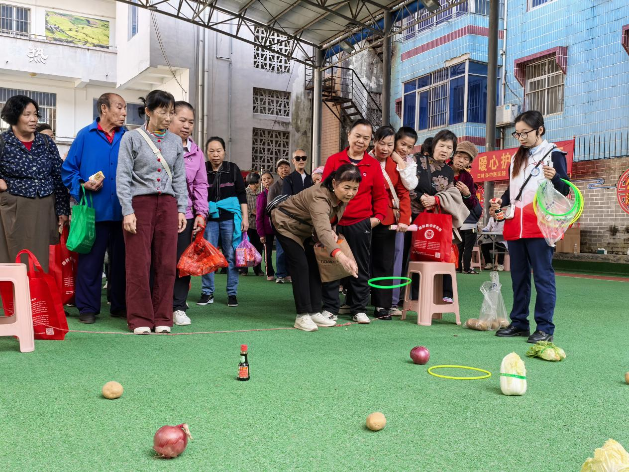 “游园送暖”活动环节,设立三大体验区,打造欢乐“安康乐园”。便民服务区提供中医义诊、火龙罐及免费测血糖、手机贴膜等服务;趣味游戏区设有“蔬菜套圈圈”“比大小”“门球大比拼”等互动游戏,老同志在欢笑中锻炼身心、赢取礼品。活动现场还推出“游园大闯关”活动,参与者凭集章卡兑换实用礼品,增强了活动的趣味性与参与度,更让“游园送安康”的节日温情深入人心。