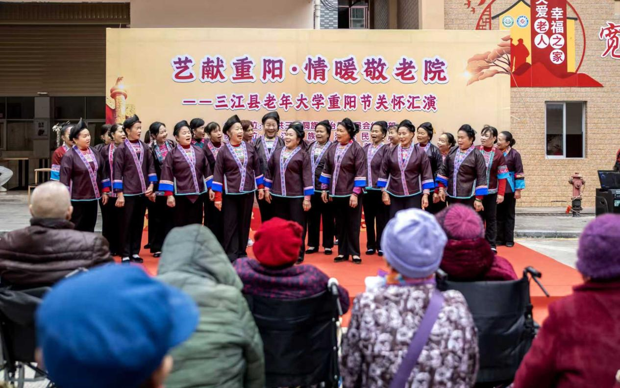 重阳佳节到来之际,三江侗族自治县委老干部局组织县老年大学80余名学员走进县康养中心,为敬老院的老年人送上一场以“艺献重阳 情暖敬老院”为主题的文艺汇演活动。