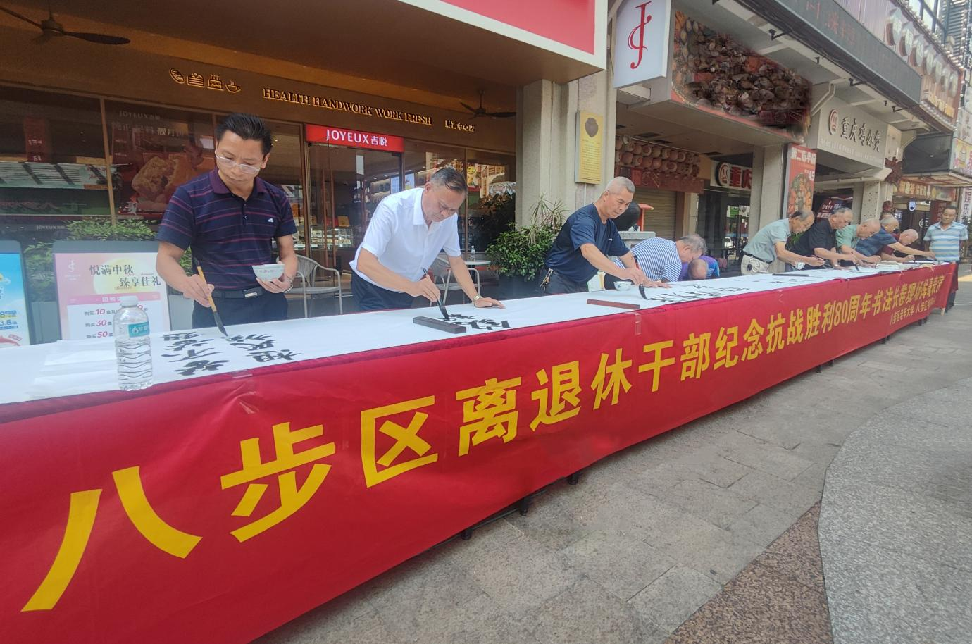 9月3日,贺州市八步区老年大学联合八步区书法家协会在城东街道灵峰社区举行“铭记抗战历史 谱写银龄新篇”书法长卷现场挥毫表演。百余位离退休干部和社区群众齐聚一堂,在共同观看纪念中国人民抗日战争暨世界反法西斯战争胜利80周年大会后,以书法重温峥嵘岁月,抒发爱国情怀。