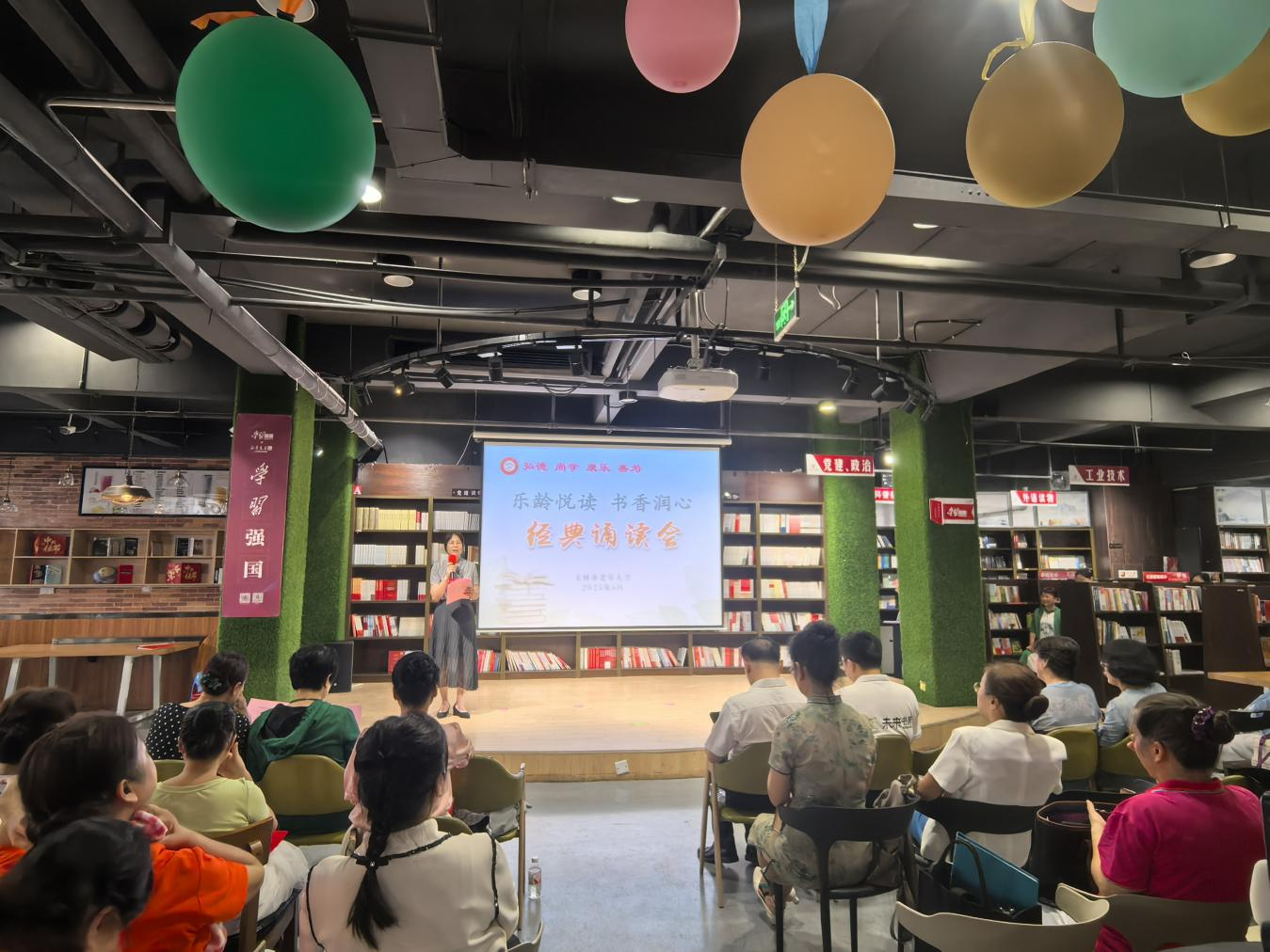 近日,玉林市老年大学在市新华书店举办以“乐龄悦读 书香润心”为主题的经典诵读会。玉林市老年大学常务副校长阮世燕、玉林市读书协会会长雷斌出席会议并分别致辞,共有40余名学员参与诵读表演。