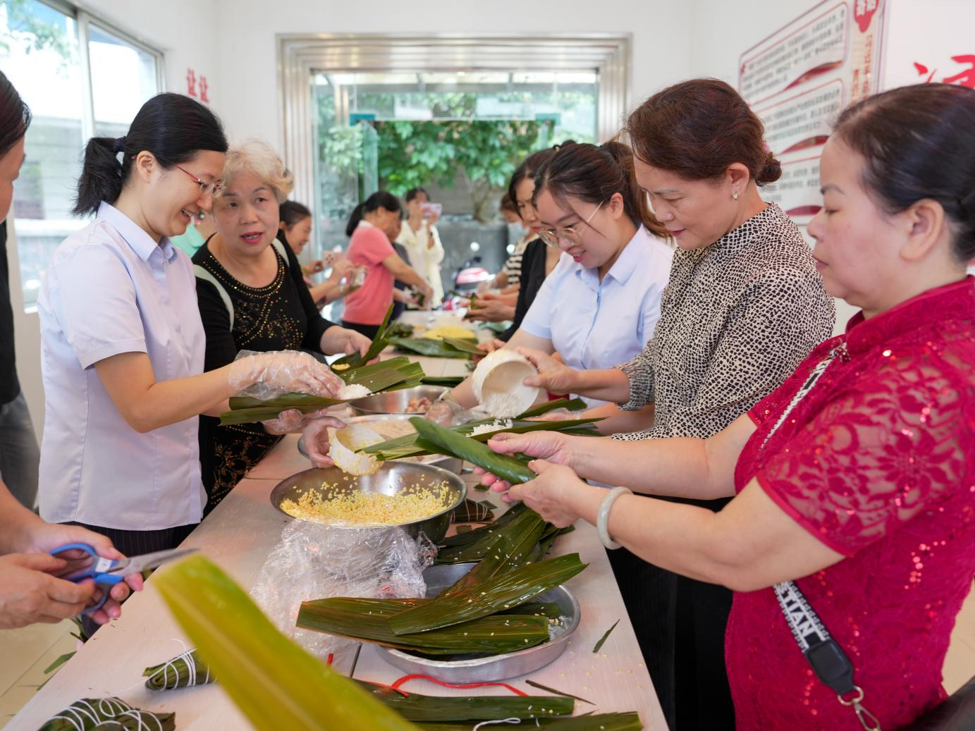 趣味游戏区,抛圈、飞镖、投球等项目,让学员们仿佛回到童年,大家全神贯注、各显身手,现场加油声、喝彩声此起彼伏。包粽子区域,学员们围坐在一起,捋粽叶、填糯米、扎捆绳,巧手翻飞间,一只只棱角分明的粽子成型,粽叶清香与欢声笑语交织,将端午氛围推向高潮。