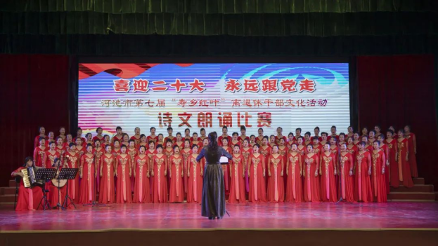 为进一步丰富离退体干部精神文化生活,在全市离退休干部中营造喜迎二十大的浓厚氛围,展示全市离退休干部向上向善的精神风貌,9月22日,“喜迎二十大 永远跟党走”河池市第七届“寿乡红叶”离退休干部文化活动在市老年大学新校区举办开幕式。市人大常委会副主任陈会邦出席开幕式并讲话,宣布“喜迎二十大 永远跟党走”河池市第七届“寿乡红叶”离退休干部文化活动开幕,覃绍明、银星灿、王佳玉、朱发生、吴胜梅、覃现超、唐毓秀、苏志宏、韦凯钟等厅级老领导以及市老干部工作领导小组成员单位领导参加开幕式并观看诗文朗诵比赛。市委组织部副部长、老干部局局长罗平介绍本届活动安排,市委老干部局副局长俞莺主持开幕式。