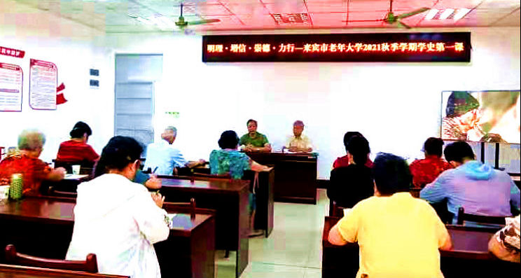 9月6日,来宾市老年大学秋季学期开学,以学党史“明理”“增信”“崇德”“力行”、学英模为第一课。来宾市委组织部副部长、市委老干部局局长权永能开课。