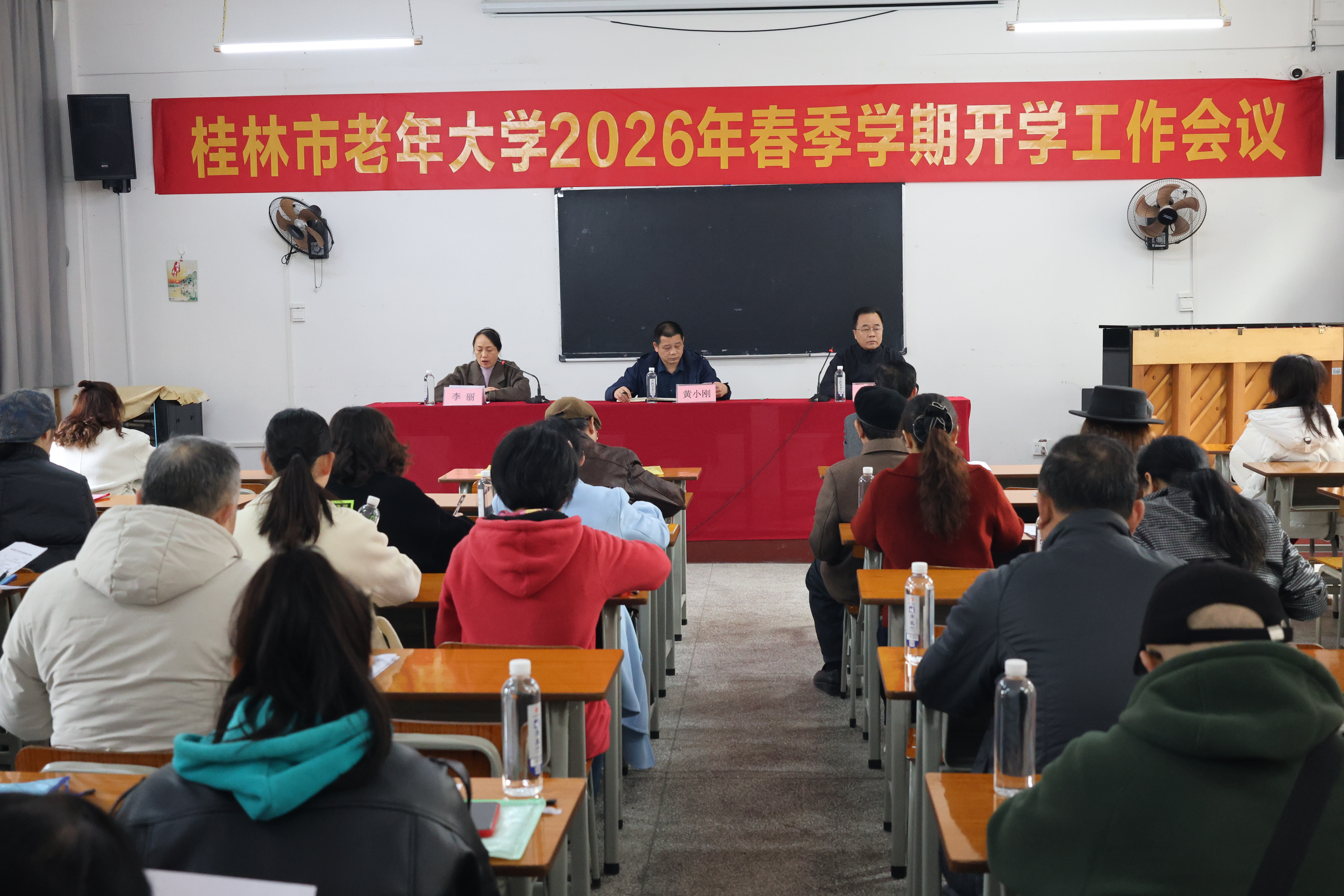 近日,桂林市老年大学召开2026年春季学期开学工作会议。全体教职工参加会议,共同谋划新学期发展蓝图。 会议对2025年学校工作进行了全面总结,回顾了过去一年学校在教育教学、文化活动、学员服务等方面取得的成绩,并客观分析存在的问题;立足学校发展实际,对2026年春季学期的重点工作进行详细部署,为新学期各项工作的有序开展明确了路径和方向。 会议强调,面对新时代老年教育的发展趋势,全体教职工要坚持情怀育人,始终对学员饱含深情,以儿女之心、晚辈之情对待老同志,营造温馨和谐的校园氛围。要坚持匠心治学,在教学工作上精益求精,做到教学有特点、内容有创新、成果有显著,不断提升课堂教学质量,满足老年人日益增长的精神文化需求。要坚持特色办学,紧跟桂林市发展步伐,在专业设置上大胆创新,积极探索将文化旅游融入日常教学,开发具有地方特色的课程,让老年学员成为桂林历史文化的传承者和宣传员,助力桂林世界级国际旅游城市建设。要坚持安全底线,时刻关注学员的上课状态与身心健康,熟知各类突发事件应急预案,做到防患于未然,确确实实为学员们提供一个安全、安心的学习环境。