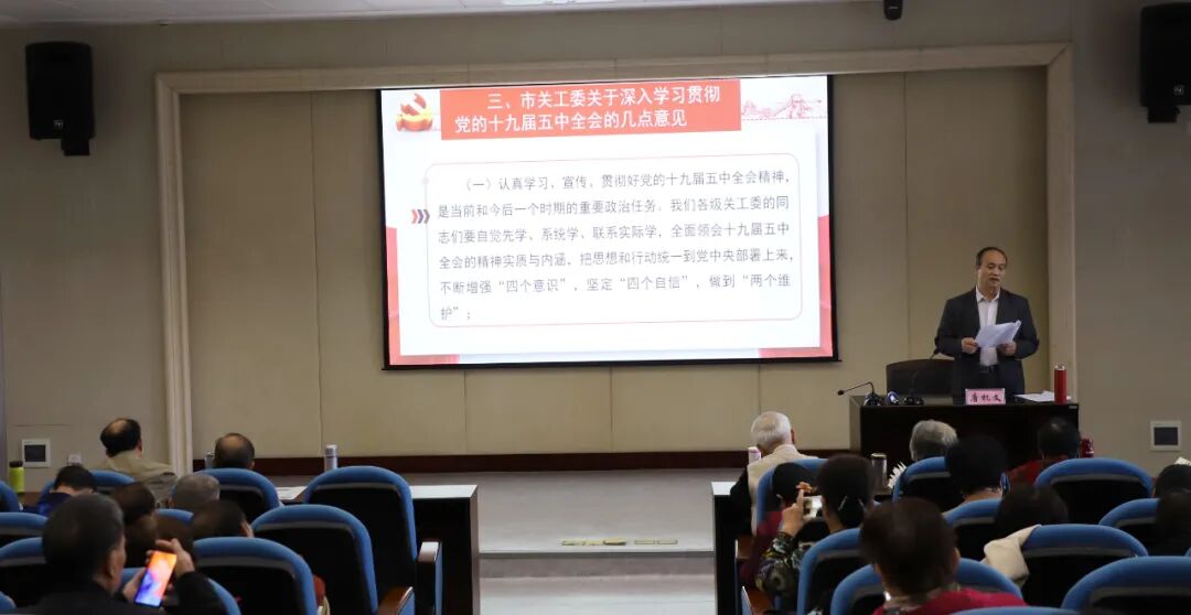 11月13日,在柳州市关工委系统基层干部业务培训班上,市关工委驻会副主任唐机文给培训学员们传达学习贯彻党的十九届五中全会精神,县、区关工委和市教育局关工委的驻会主任、五老骨干代表共117人听取汇报。