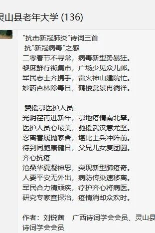 “光阴荏苒进新年,鄂地疫情南北牵。医护人员心最美,驰援武汉意尤坚。忍离眷属抛家舍,堪比士兵冲阵前。待到同胞康健日,父兄儿女复团圆。”退休干部刘锐茜满怀深情写下诗词《赞援鄂医护人员》,赞美最美逆行者,为战“疫”在一线的白衣天使们加油打气。县老年大学老师及学员创作了诗词《全国救灾一盘棋》、《赞战场上科学家》,书法《众志成城,天佑中华》等165篇(幅)接地气的正能量文艺作品,他们持续在网络、微信、QQ上发声,赞颂在一线默默奉献的英雄,表达战胜疫情的坚定信心和共克时艰的坚定决心,为打赢疫情防控阻击战鼓劲呐喊、加油助威,凝聚正能量。
