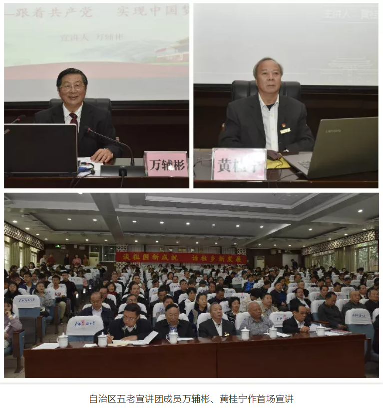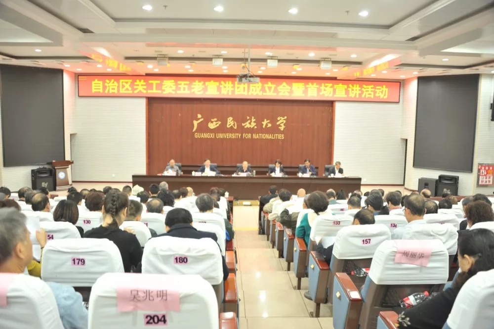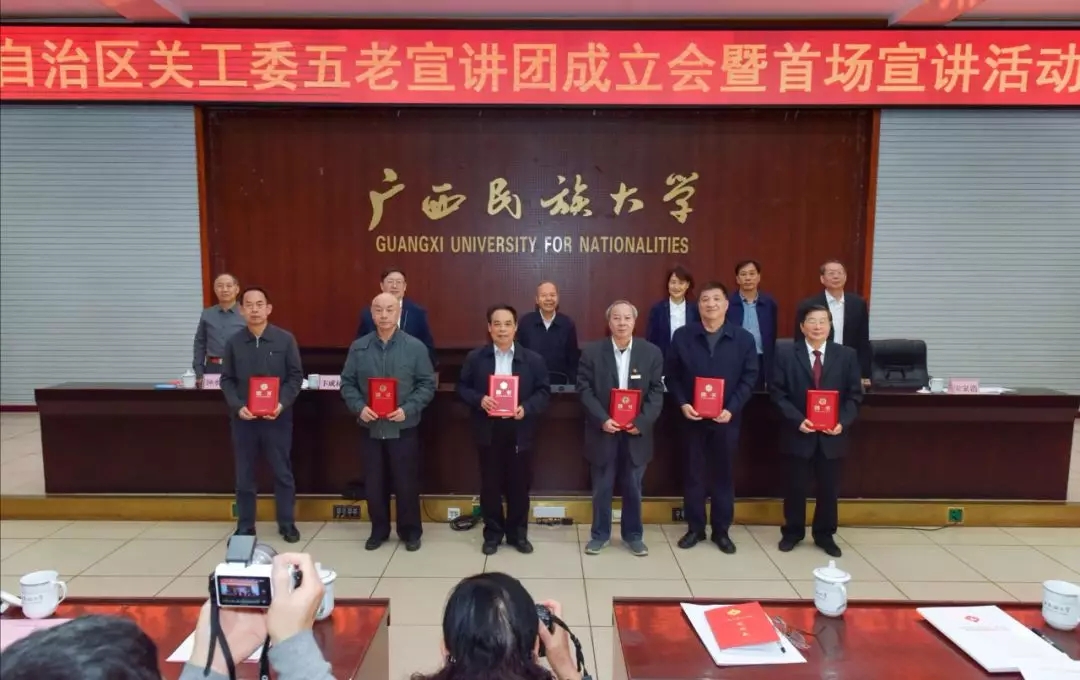 11月26日,自治区关工委在广西民族大学召开自治区五老宣讲团成立会暨首场宣讲活动。自治区关工委主任张少康,自治区党委组织部副部长、自治区党委老干部局局长(自治区党委离退休干部工作委员会书记)曾艳,自治区关工委副主任钟水生、宋家浩,广西民族大学党委书记卞成林,还有来自14个设区市、区直有关厅局、高校、中国铁路南宁局集团关工委组成的自治区关工委宣讲团成员,14个设区市关工委的分管领导、办公室负责同志参加了会议。活动由自治区党委老干部局副局长、关工委常务副主任李世科主持。 张少康指出,成立自治区五老宣讲团是推动新时代关工委工作的迫切需要,要把“立德”融入青少年成长的全过程,融入思想道德教育、文化知识教育、社会实践各环节,让理想信念、爱国主义精神的种子在青少年心中深深扎根,又要把“树人”贯穿青少年成长的全过程,贯穿基础教育、职业教育、高等教育各领域,使关心下一代工作不断拓宽覆盖面、增强系统性,使一代代青少年茁壮成长起来,成为堪当民族复兴大任的时代新人。