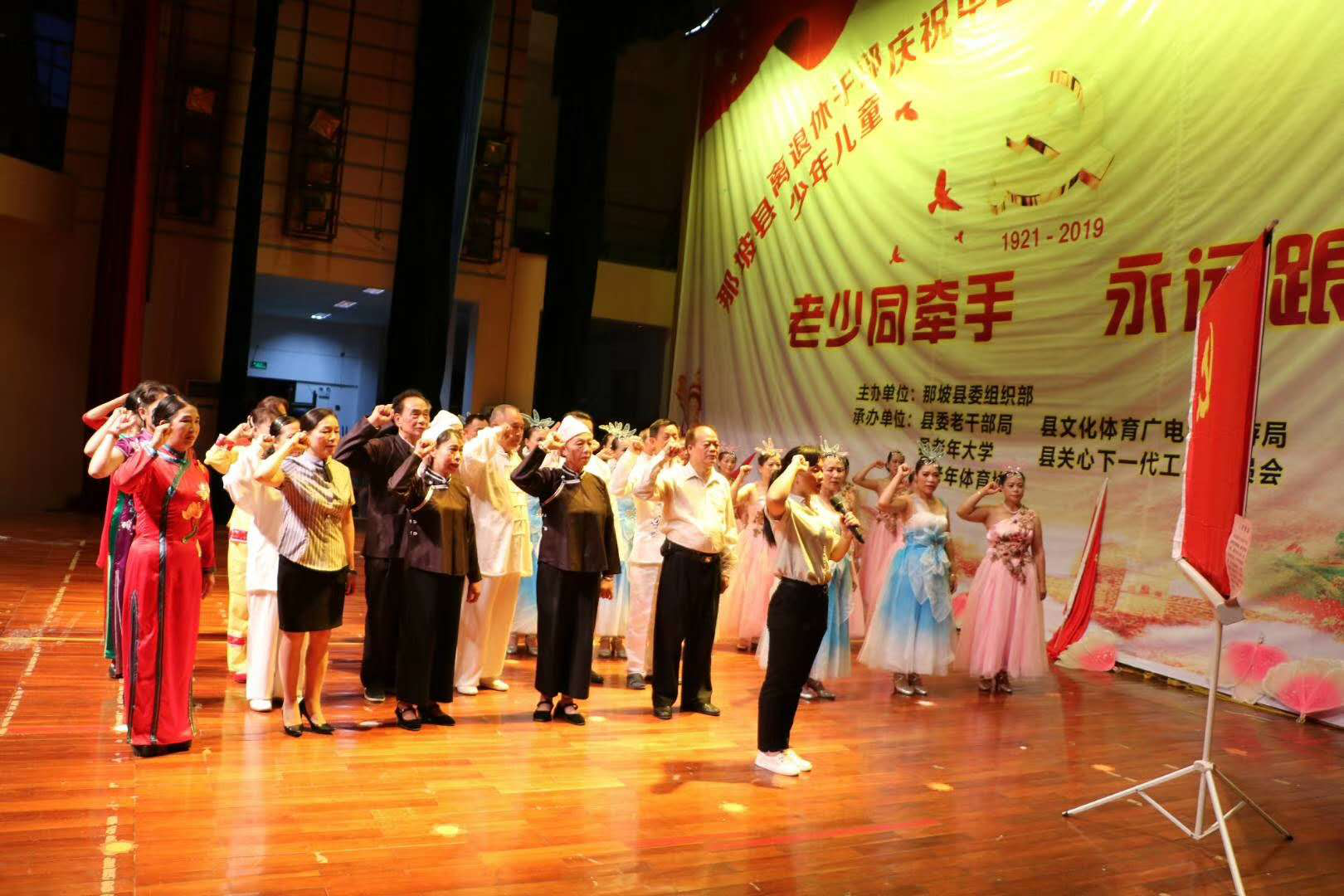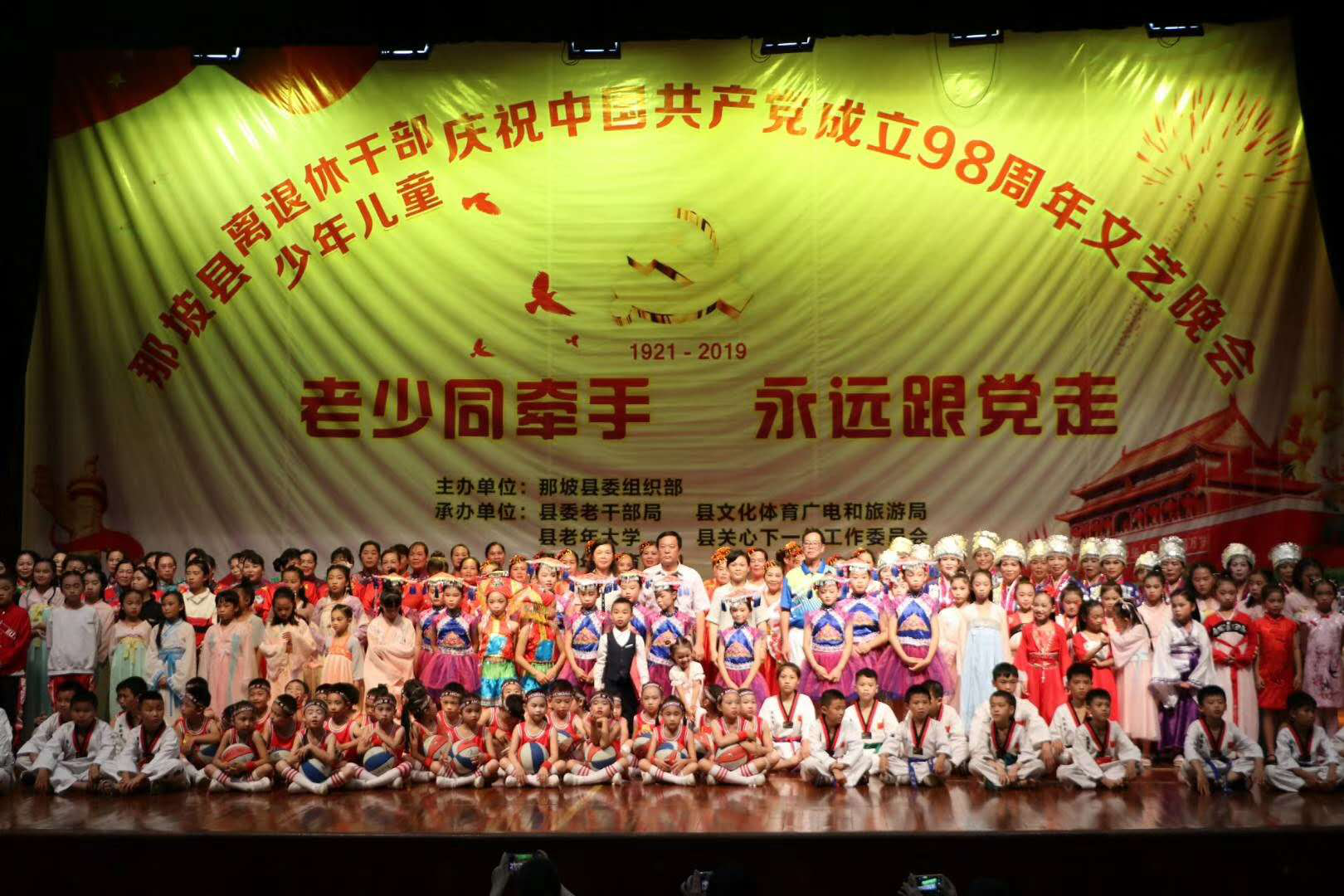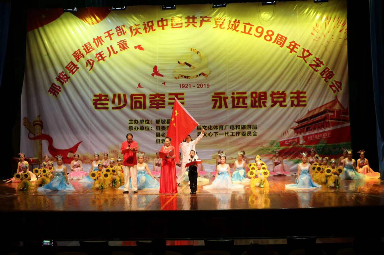 6月27日晚,由百色市那坡县委组织部主办、那坡县老干部局、那坡县文化体育广电和旅游局、那坡县老年大学、那坡县关心下一代工作委员会、那坡县老年体协承办的“老少同牵手 永远跟党走”文艺晚会在县人民大会堂隆重举行。