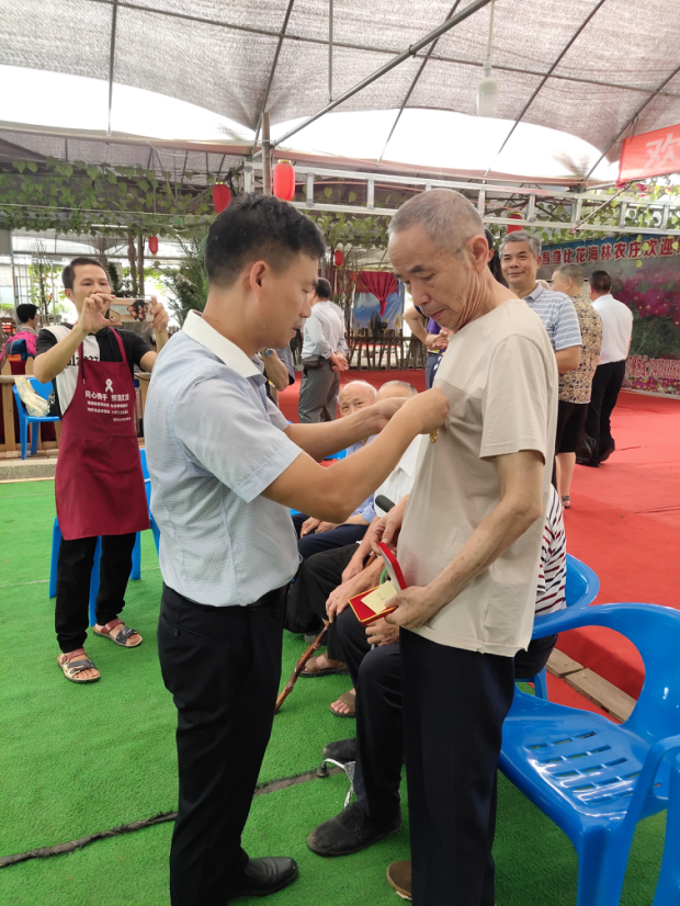 镇党委书记邓芳军为50周年以上党龄老党员颁发和佩戴纪念章