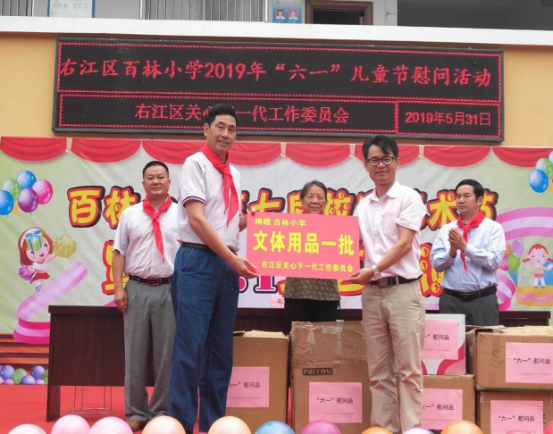 5月31日,百色市右江区关工委主任韦宗涛、副主任岑小玲、谢克先等一行代表区委、区政府到右江区百林小学开展“六一”慰问活动。韦主任一行向全区的少年儿童致以节日的祝贺!并寄语全区的少年儿童牢记中国近代史以来民族抗争图强的历史,牢记中国共产党领导全国人民100年的奋斗历史,牢记帝国主义亡我之心依然不死的严峻现实;要珍惜美好时光,把个人的梦想与中华民族伟大复兴的“中国梦”结合起来,树立远大理想,好好学习,天天向上,成长为有理想、有道德、有文化、有纪律的一代新人,把右江区建设得更加美好,把祖国建设得更加富强。