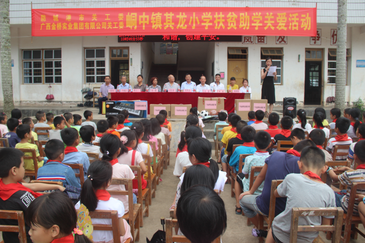 图为防城港市关工委联合广西金桥实业集团关工委在防城区峒中镇其龙小学举办扶贫助学关爱活动。
