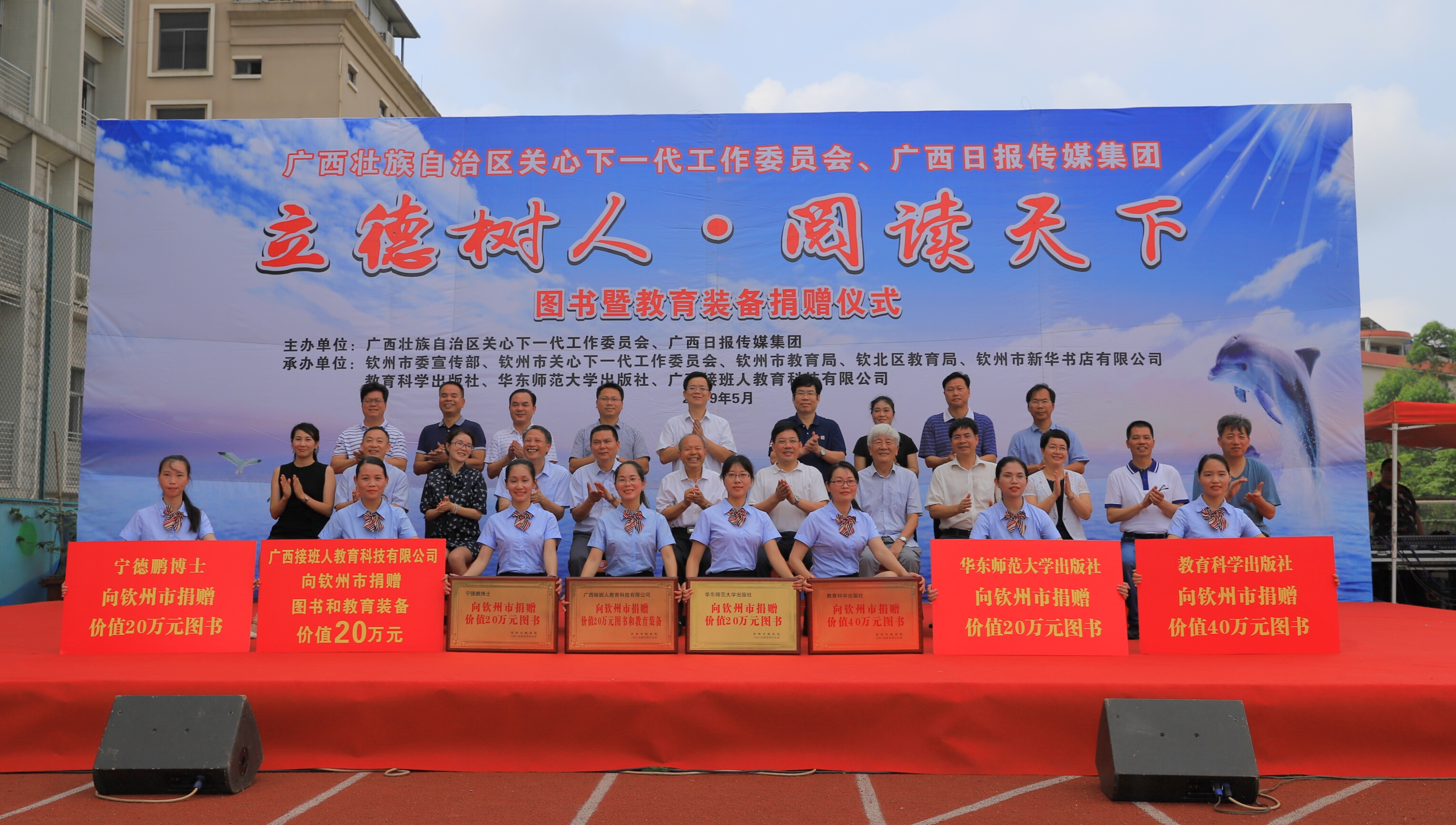 在当天的捐赠仪式上,捐赠单位及爱心人士向钦州市有关学校共捐赠了价值100万元的图书和教育装备:教育科学出版社捐赠图书价值40万元,华东师范大学出版社捐赠图书价值20万元,广西接班人教育科技有限公司捐赠图书及教育装备价值20万元,热心教育公益事业人士宁德鹏博士捐赠图书价值20万元。