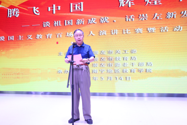 5月14日,崇左市关工委、崇左市教育局、崇左市委老干部局在南宁地区教育学院举办首场“腾飞中国·辉煌70年——谈祖国新成就,话崇左新发展”爱国主义教育百场千人演讲比赛。自治区关工委副主任钟水生到场指导演讲比赛。市政协原主席、市关工委主任蒙结,市委组织部副部长、老干部局局长韦桂德,南宁地区教育学院院长李贵卓,市委老干部局副局长何珊,市教育副局长韦鸿飞等领导,各县(市、区)关工委主任、老干部局局长,南宁地区教育学院500多名师生参加演讲活动。