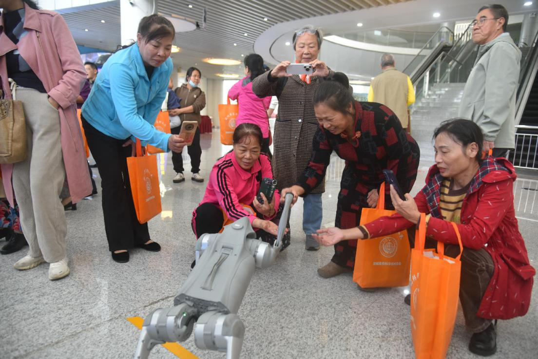 活动采取场内科普讲座与场外互动体验相结合的形式开展。场内科普讲座现场,中国联通防城港市分公司互联网产业研究院负责同志带来AI养老专题讲座,围绕“适老化服务”“防电信诈骗”展开,从AI认知到风险防范层层递进,答疑环节中老同志举手不断提问,现场热情高涨。中国邮政储蓄银行防城港市分行负责同志以图文并茂形式普及人民币识假知识,有效增强老年朋友的用“币”意识。防城港市美术家协会副主席、市科技馆青少部负责同志带来的“AI+书画”主题讲座,以别出心裁的创意引发全场关注。现场展示AI与传统书画的融合创作,激发了在场观众对科技与艺术融合的浓厚兴趣,为他们开启了一扇利用智能工具进行艺术创作、丰富精神文化生活的新窗口。场外互动体验现场,老同志们沉浸式体验前沿科技应用场景。明星机器人“阿尔法”和机器狗“笨笨”吸引了众多目光,大家通过触控交互、语音对话等方式,系统了解人工智能技术的应用场景与发展趋势,现场互动充分展现出科技适老化服务的创新成果。