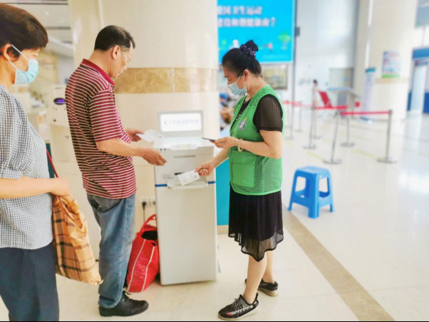 “请问有什么可以帮到您的?”“预约挂号的请到二楼护士站取号”,“心电图检查请到医技楼二楼检查,请您跟我来”......活动中,老同志们主动维持门诊就诊秩序,引导就诊群众到相应诊室就诊或进行检查,并指导患者及家属申请电子健康卡,为老行动不便的患者提供轮椅,老同志们热心、耐心的服务,得到了患者及家属的点赞。