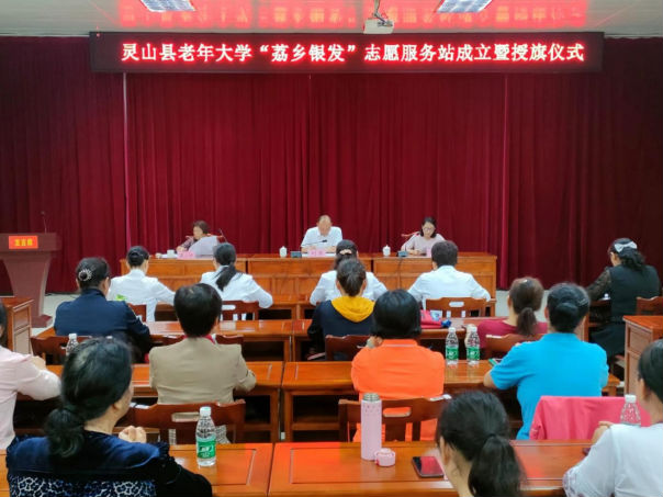 近日,钦州市灵山县老年大学“荔乡银发”志愿服务站成立,县委组织部副部长、老年大学校长刘湛对“荔乡银发”志愿服务站的成立表示祝贺,并为新成立的5支志愿服务队授旗。